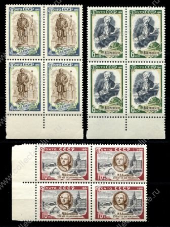 СССР 1961 г. • Сол# 2639-41 • Михаил Ломоносов, 250 лет со дня рождения • полн. серия • кв. блоки • MNH OG XF+ (Product code (SKU): US-0746)
