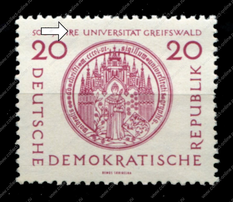 ГДР 1956 г. • Mi# 543v • 20 pf. • 500 лет университету Грайфсвальд • разновидность • MNH OG VF (Product code (SKU): US-0063)